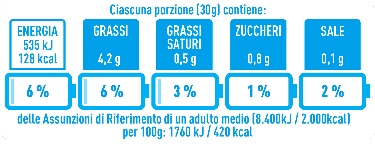 | Valori | Per 100g | Per biscotto ~9,5g |